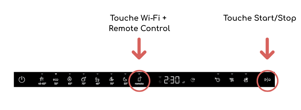 Appuyez sur la touche Wi-Fi de votre lave-vaisselle pour activer le mode Remote Control. Selon le modèle, il peut être nécessaire d’appuyer également sur la touche Start/Stop.