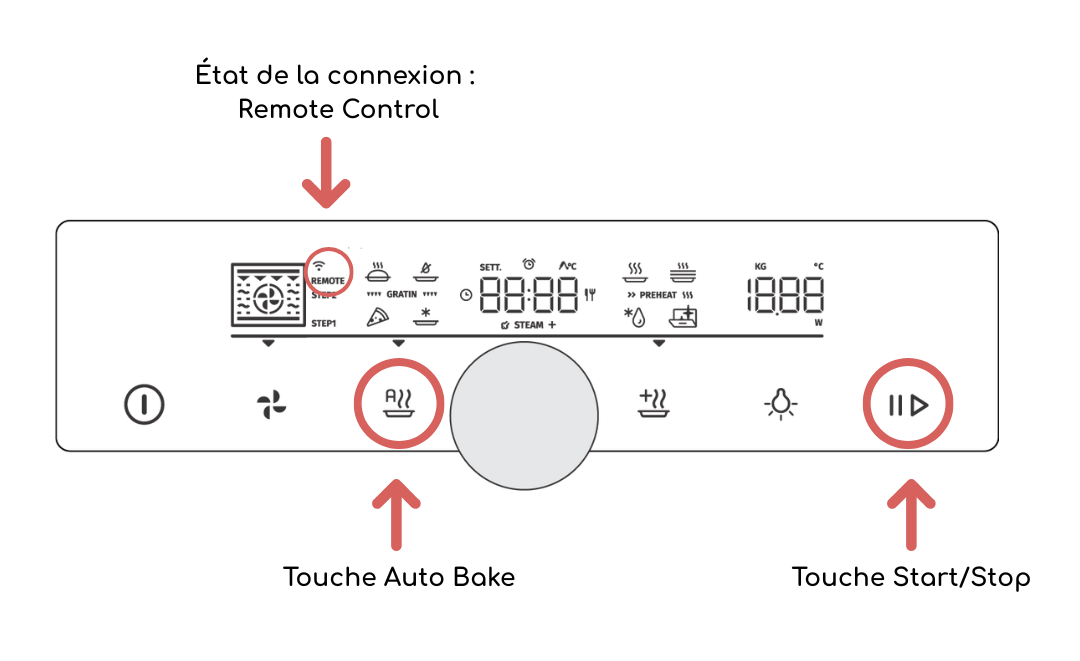 - Vérifiez l’état de la connexion.L’icône Wi-Fi doit apparaître en blanc fixe, ce qui signifie que votre four est connecté au réseau Wi-Fi et peut déjà être surveillé à distance. Toutefois, la commande à distance n’est pas encore activée.