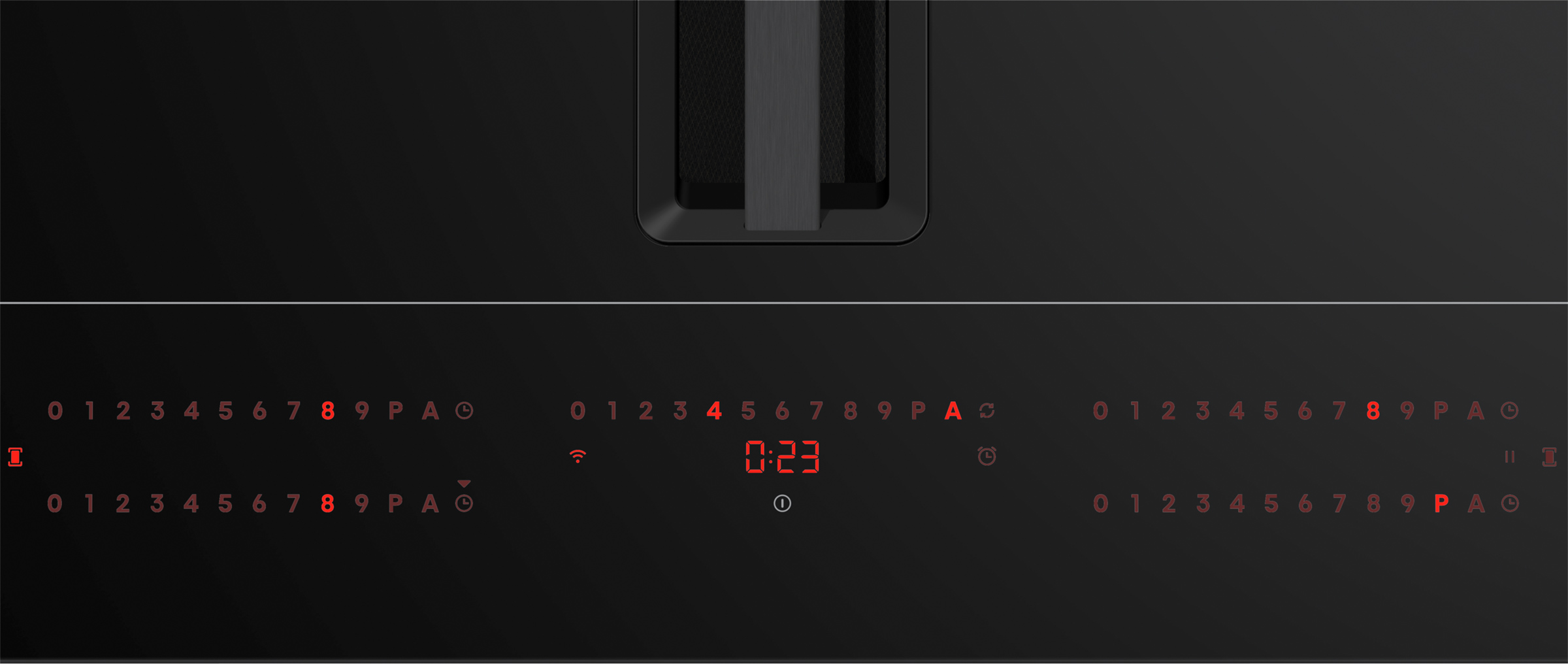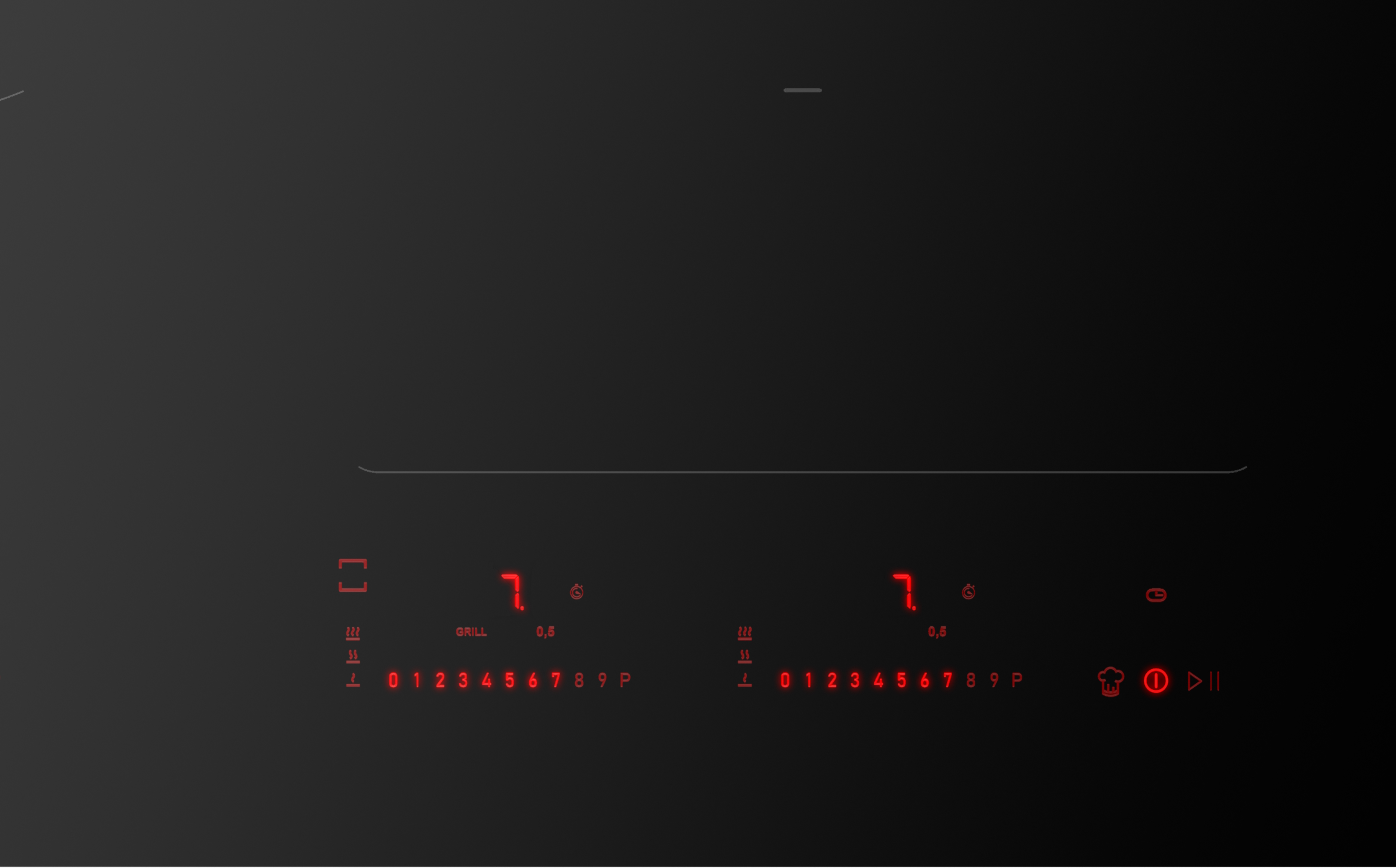 Indien nodig: koppel het toestel los van het stroomnet, wacht 10 seconden en koppel opnieuw aan op het stroomnet. - Houd op de sliderbediening van de kookzone linksvoor de 0 ingedrukt. Raak tegelijk met de 0-toets, achtereenvolgend de 6 , 8 en P aan. Elke geldige aanraking van de aan-/uittoets wordt bevestigd door een geluidssignaal.