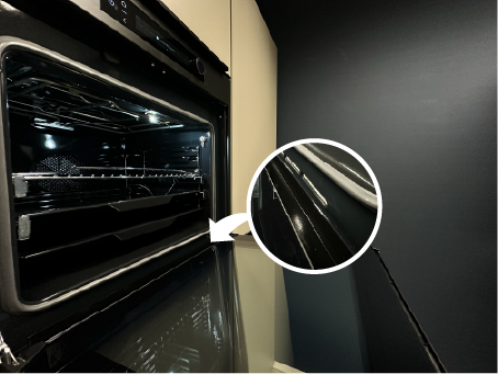 Bij het openen van de deur zie je, tussen de onderkant van de deur en de ovenrand, een kleine condensgoot. Deze is bedoeld om druppels van de deur op te vangen bij het openen van de oven.